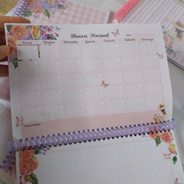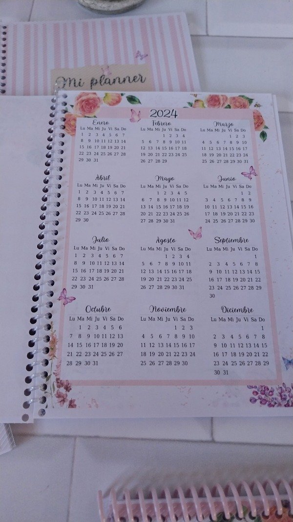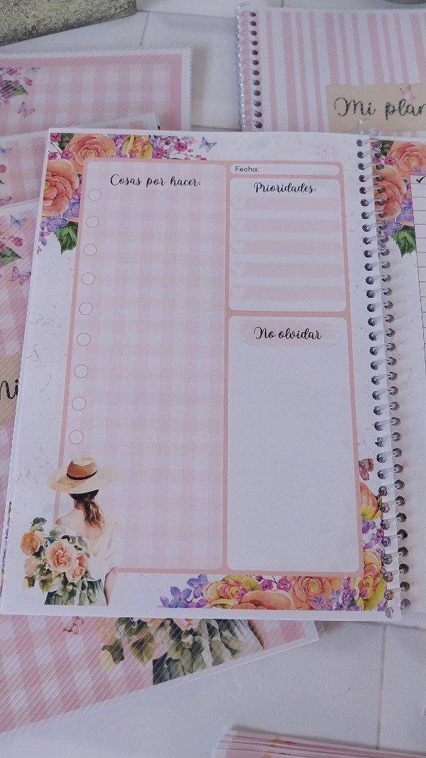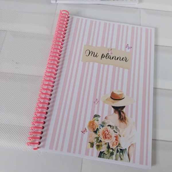 Cuadernillo con tapa ilustrada con protección plástica o plastificado. Anillado color. 60 páginas a color. Calendario. Portada. Planners mensuales y diarios perpetuos. Hojas de compras y hojas para notas. Tamaño A5