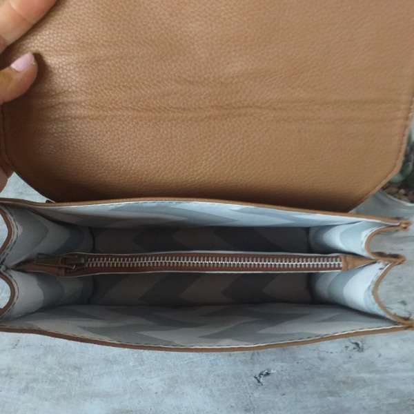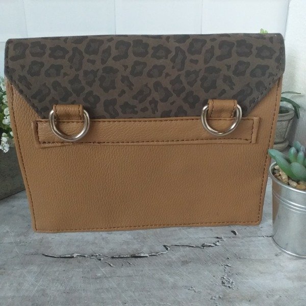 Cartera bandolera de ecocuero combinado con 2 posiciones de Correa... Correa de ecocuero. Enganche trasero. 3 compartimientos internos. El central con cierre. Cierra con tapa y broche imán.