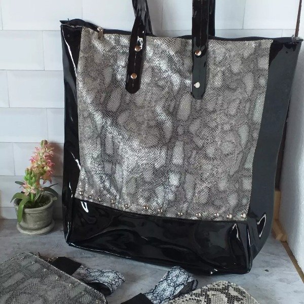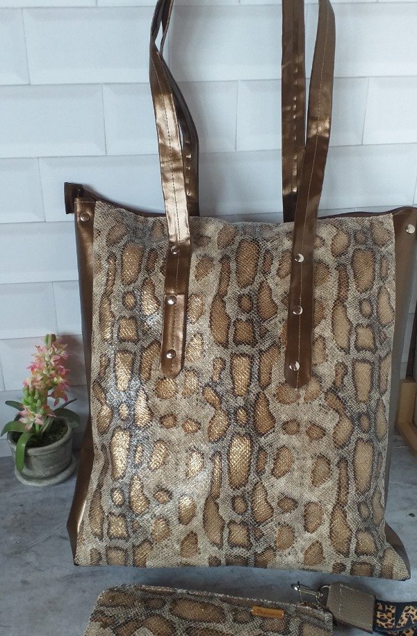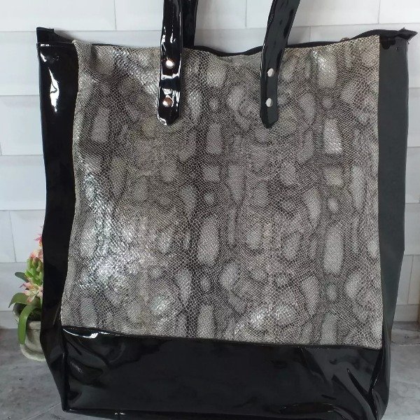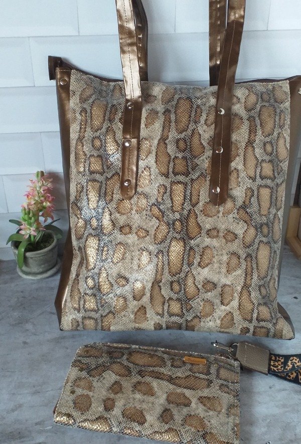 Amplio bolso en tela transfer blanco/ negro y marrón/ cobre...