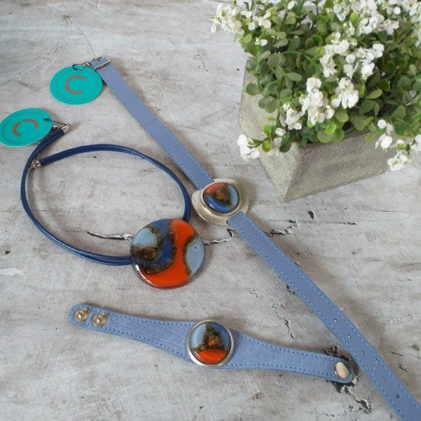 Importante collar con pieza central de vitrofusion. .. tiento de cuero