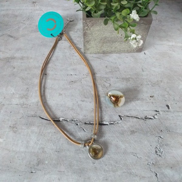 Collar de tiento de cuero con pequeño dije de metal con pieza de vitrofusion..
