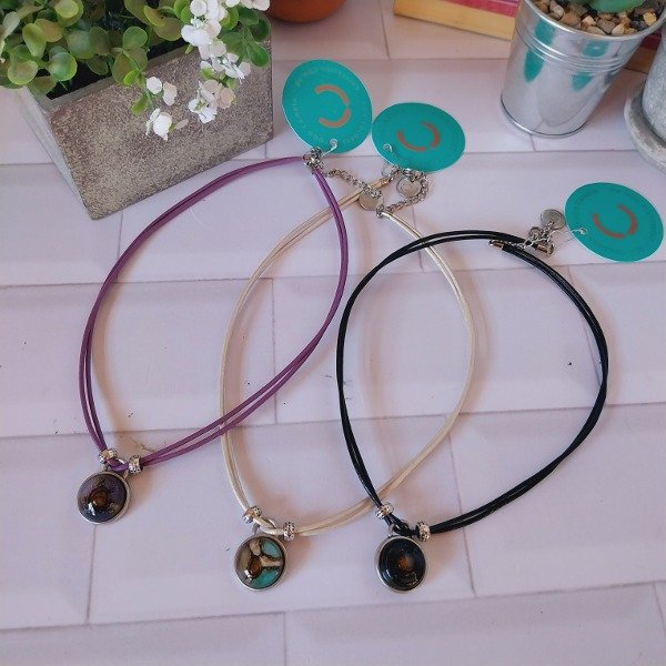 Collar corto, con pieza de vitrofusion chica en base de metal en forma de dona en amarillo. Cadena de alargue.
