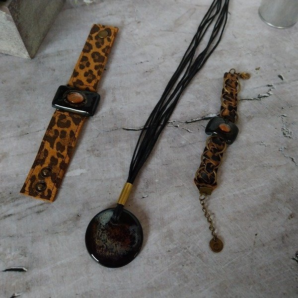 Collar largo, dije redondo en tonos negros y destellos dorados
