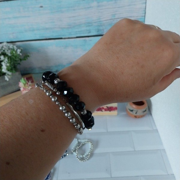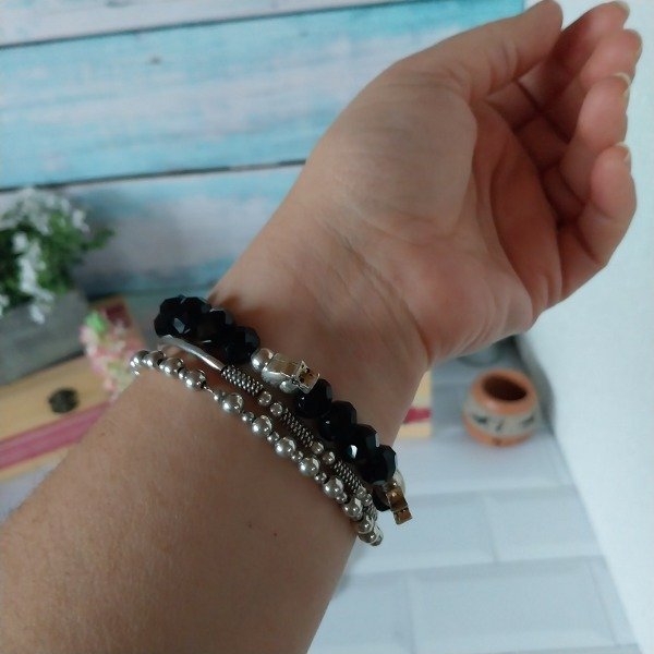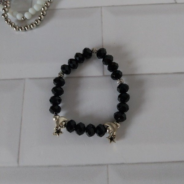 Pulsera elastica de cristales negros. Con dijes metálicos intercalados. Ajustable por tanza