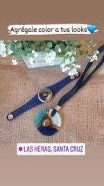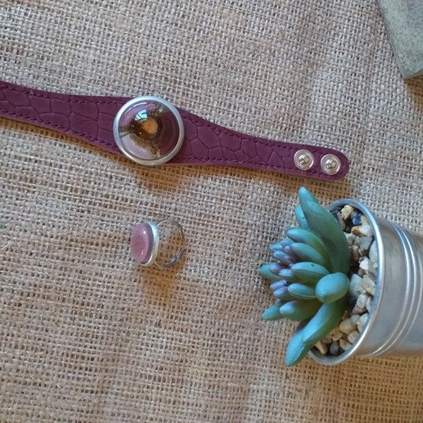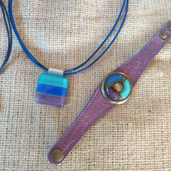 Pulsera de cuero vacuno con pieza de vitrofusion redonda sobre base metálica. ...disponible en otros colores