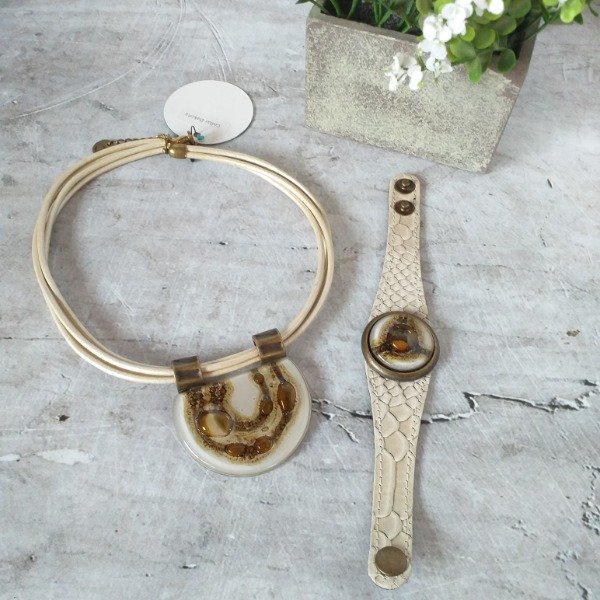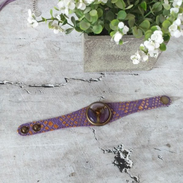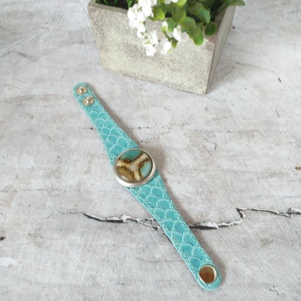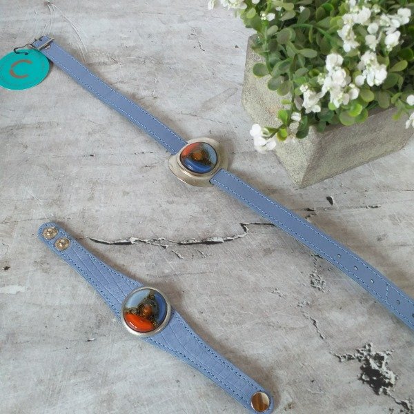 Pulsera de cuero vacuno con dije metálico y pieza de vitrofusion ... 2 medidas de cierre conn broche