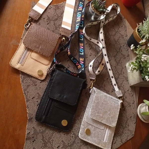 Minibags plana... compartimiento para celular, tarjeteros delanteros ... cierre con tapa más broche imán. .. bolsillo con cierre para monedas o billetes. .. Correa sublimada ajustable . Colores: plateado, nude con cobre, verde esmeralda