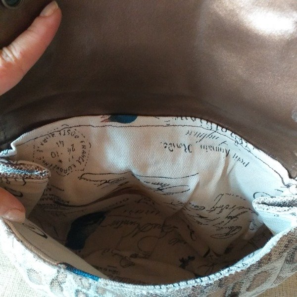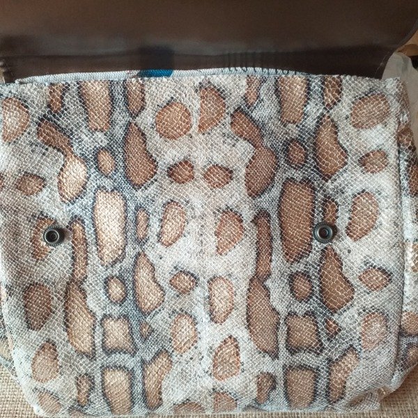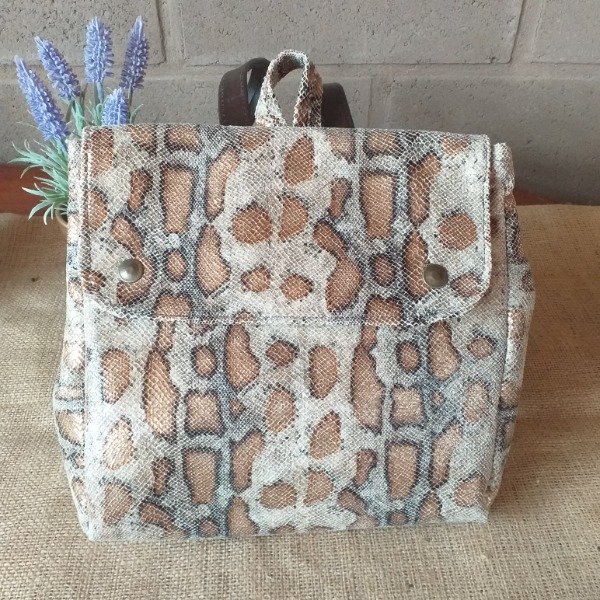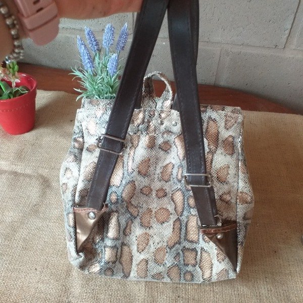Mochila mediana tela transfer con brillos dorados y cobres... cierra con tapa y doble broche a presión...correas ajustables de eco cuero. Forrado en lienzo estampado