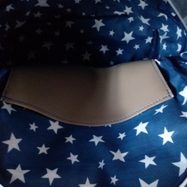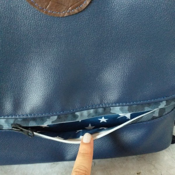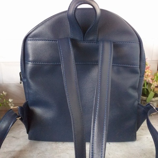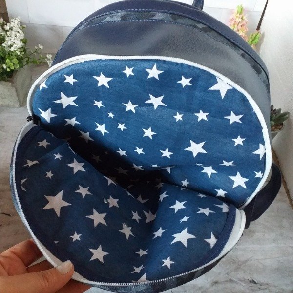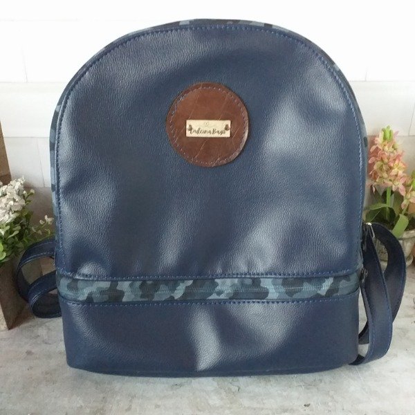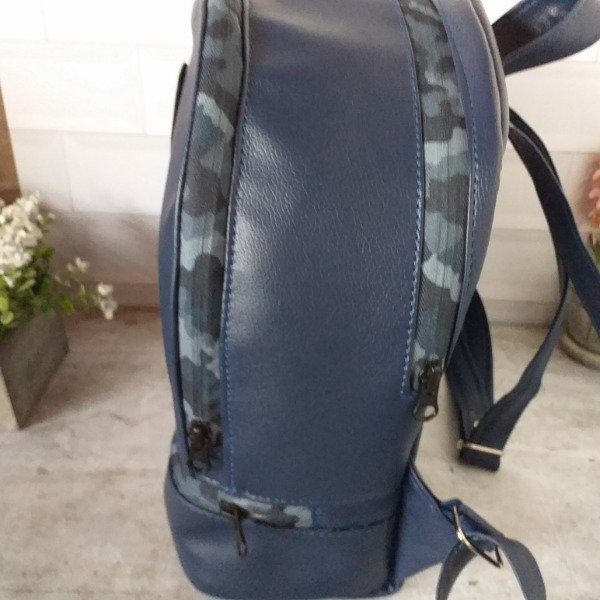 Bolsillo inferior delantero que va de lado a lado. .. acceso superior con cierres camuflados en azul marca Ykk...... manija de agarre superior y correas de cuero ecológico para la espalda..forreria al tono
