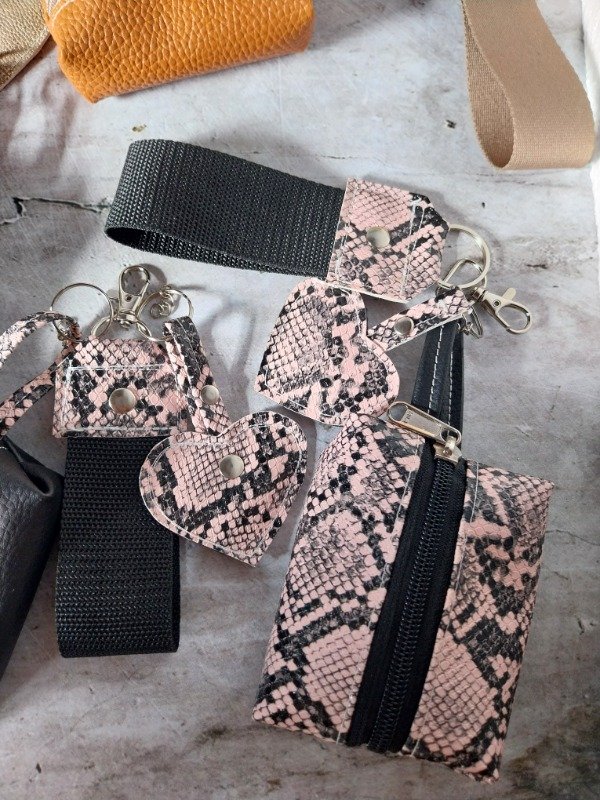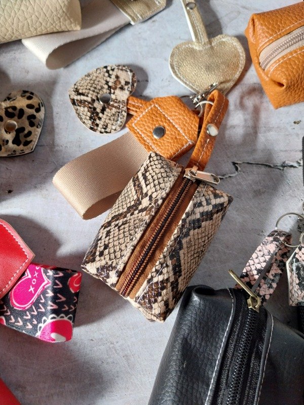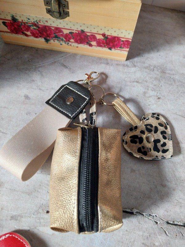 Estuche con cierre. Llavero corazon. Llavero de cinta. Dijes en cadenitas de niquel. Consultar colores disponibles